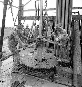 Tripping pipe in the early 1930’s. The stack is behind the man on the right. Calisphere