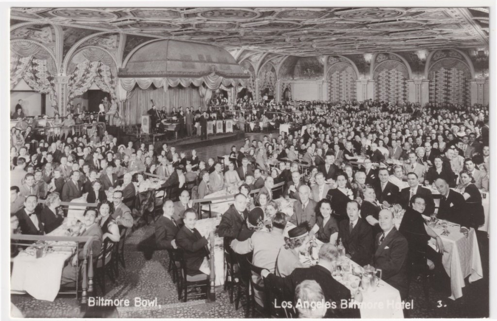 Most importantly for my mother and her friends was the basement nightclub known as the Biltmore Bowl. With it’s two story ceiling and with a size that would accomodate 2,000 dancers and guests, it had hosted 8 Academy Awards ceremonies since its opening. Saturday nights it would be standing room only. The girls played dress up trying to look like stars themselves. Oh so suave, smoking in the days fashion, mom said they were swivel necks looking to see if any famous Hollywood stars were to be seen. The saw Olivia De Havilland and Lucy and Ricky Ricardo on occasion.