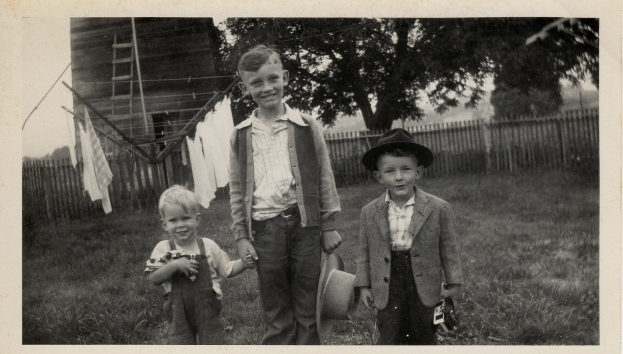 Mike, Jerry and little Cayce Shannon, all barefoot with our aunt Patsy in 1951. Tank house in the background. Route 1 box 593, Branch Mill Road. Shannon Family Photo.