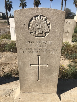Edgar Green was a British citizen, born in London, England in 1898. Living in Australia he volunteered in 1915. He served with the 2nd Australian Infantry in Egypt, Cyprus, Gallipoli and the prison camp the Yozghad POW camp, Afion Kara Hissar, Turkey, where he died of the Influenza epidemic just 30 days before the armistice. (Letters, postcards and journal in possesion of the author.)