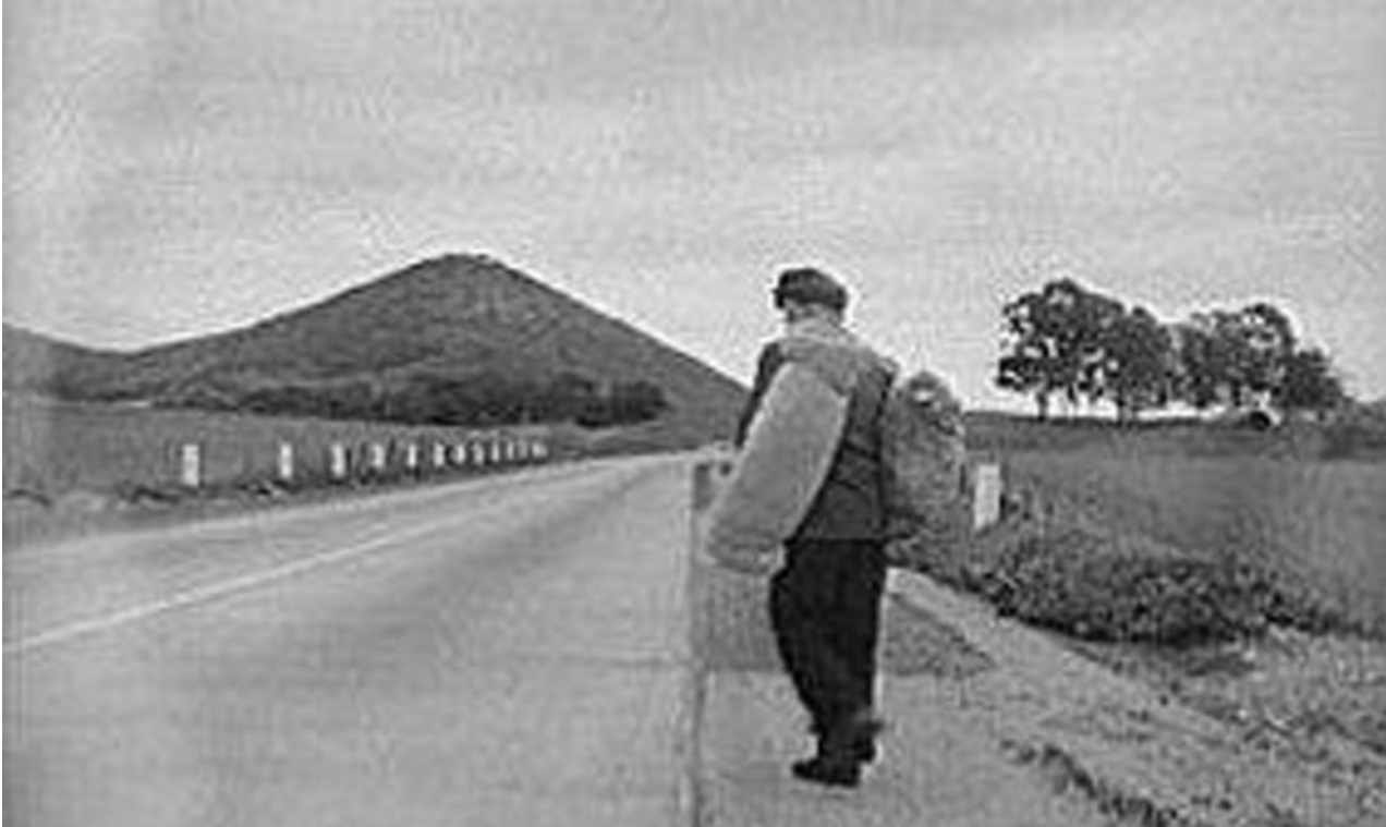 There is a photograph taken just outside my grandparents home. Its a man, a Hobo, a Bindlestiff, walking up Shannon Hill. Mount Picacho is in view just a the top of the grade. Cramer William’s home is nestled under a copse of trees on the right. The man wears bagged trousers, cuffs rolled above working mans shoes, a flat cap on his head. Slung over his right shoulder is a rucksack with all his worldly belongings, over his left, his bedroll. He’s walking away from yesterday, towards tomorrow.