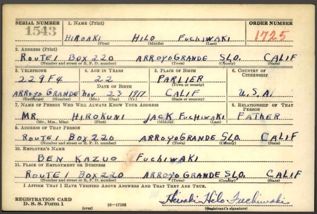 - Fuchiwaki, Hiroaki Hilo; Military Intelligence Service; volunteered from Gila River, AZ internment camp,