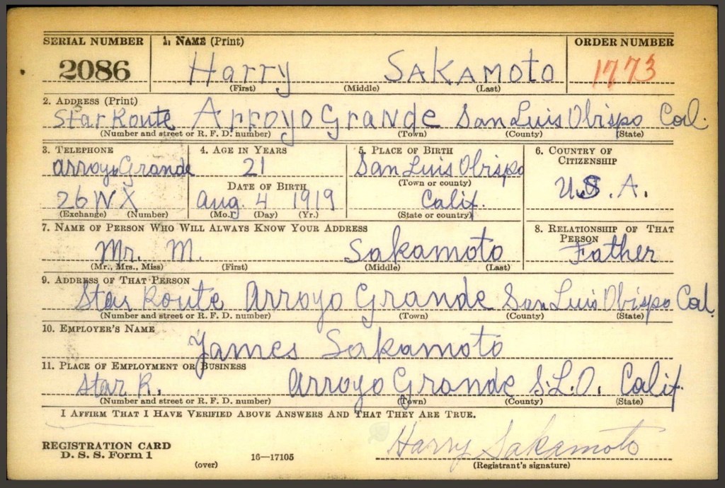 Harry Sakamoto was a staff Sergeant with the 100th, company C, he was wounded in the heel in the Vosges mountains. He had farmed with his father and brother in the upper Arroyo Grande valley before the war.