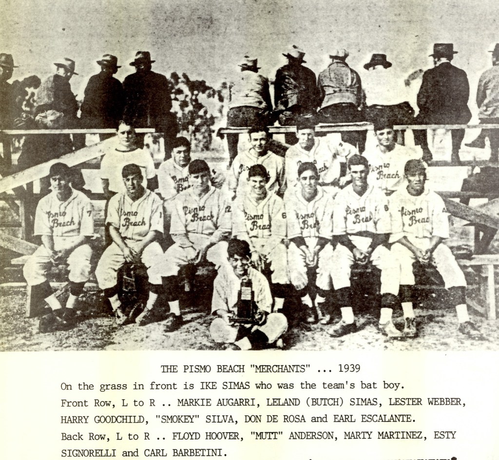 In the photo above, made up of players from Santa Maria, Arroyo Grande, Pismo and San Luis are many familiar names including Floyd Hoover and “Mutt” Anderson, owner of the Greyhound Cafe in Arroyo Grande. Butch Simas and Carl Barbettini were big supporters of the Santa Maria Indians. These guys were the fathers of the kids in my generation.