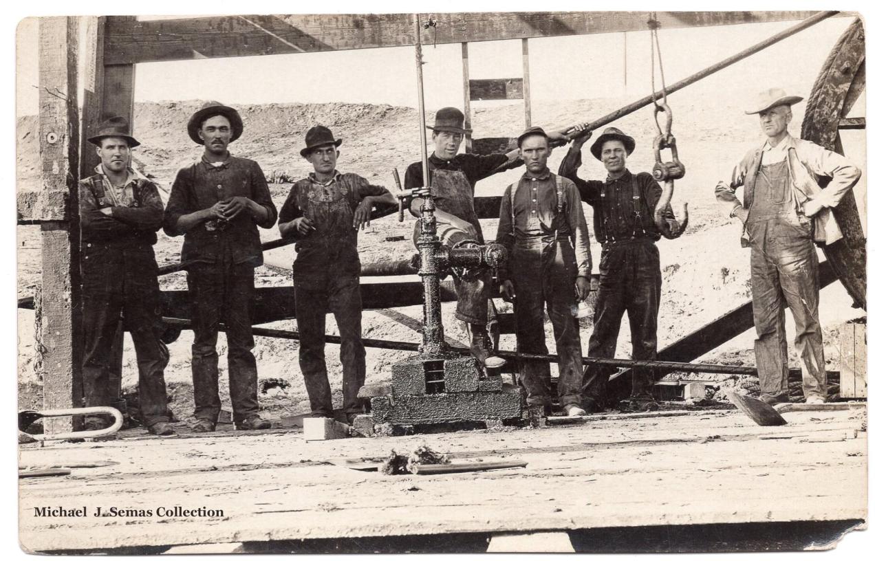 The photo above was taken by an itinerant photographer who traveled around the state taking pictures of people at work. He would set up his tripod and box camera, pose the men and click the shutter. Taking the mens names and addresses he would mail the finished prints to them. He likely charged each person in the photo about .50 cents for a copy. At $2,25 for this photo he could make a pretty decent living in a field where there were upward of 80 wells like Casmalia. It is a minor miracles that the phot has survived over a hundrd years particulary because Bruce and Eileen packed up and moved so often in their lives.