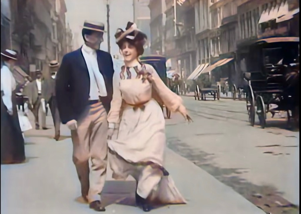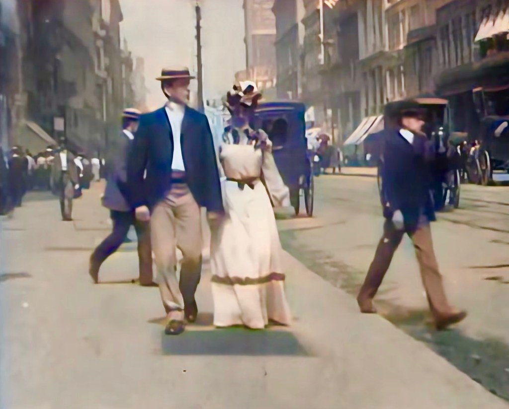 In the distance a pair of young people walk towards the lens. By their clothes they could be dressed up for a stroll towards the Hippodrome or to Delmonico’s for lunch. He in fawn colored trousers, polished shoes with toe caps, a jaunty straw boater atop; dark blue coat, sky blue shirt with a starched collar and cravat as ties were called then. She wears a white skirt over her matching petticoat and a pink shirtwaist adorned with ribbons. all tied at the waist with a velvet ribbon. Her summer straw hat has a big black and white bow.