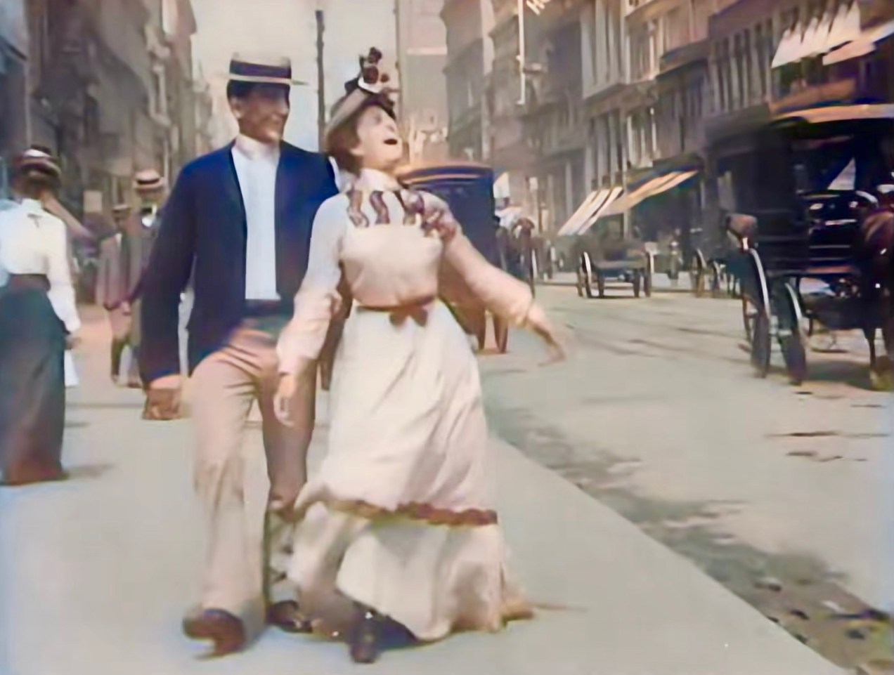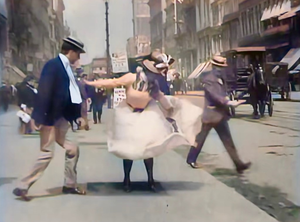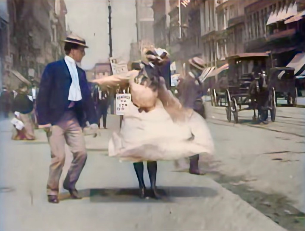 They walk towards the lens oblivious to the goings on around them. Not paying attention she walks directly over a steam grate set in the sidewalk and ala Marilyn Monroe, it blows her skirt up waist high before she can get her hands out to hold it down. High button shoes and silk stockings on display, a man crossing the street casts a sly sidelong glance. The young man turns to help, his hands reaching out towards her but embarrassed enough not to touch. Flustered she pushes her skirt back down, takes a step and turns to look at the young man, he grins. Has he seen them before? Suddenly with a smile of pure delight, she throws back her head and laughs; out loud.