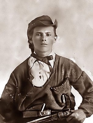 16 year old Jesse James, already a killer. He is wearing a Bushwacker shirt made by his mother. They were made with oversize pockets for ammunition and carrying three Colt six shooters. 1863. Kansas State Historical Society Photo.*