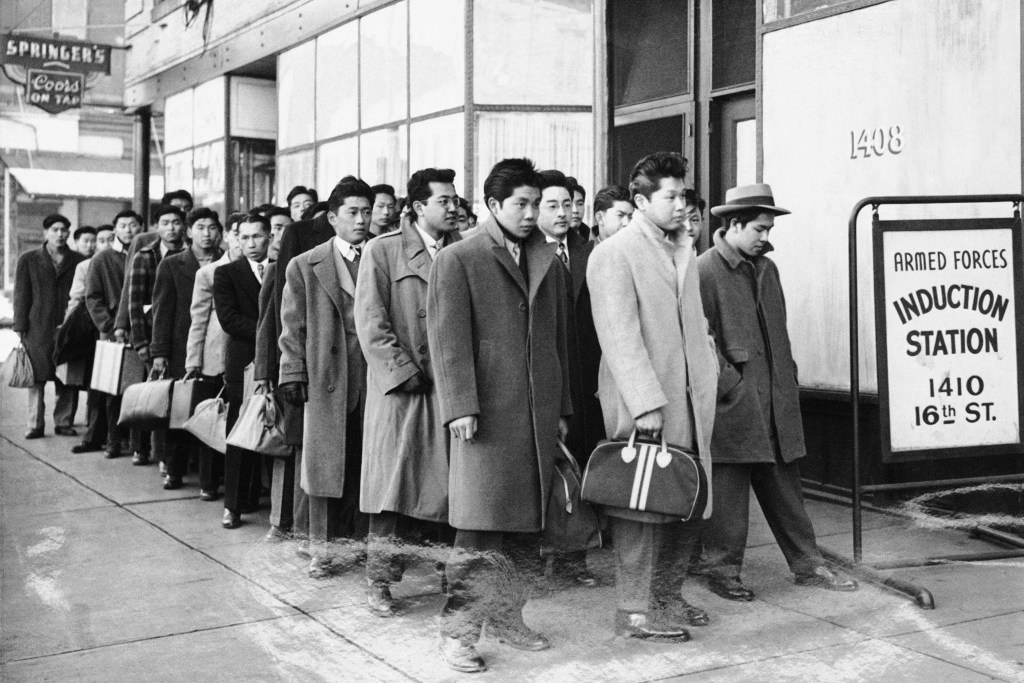 Nisei men reporting for Army induction, 1410 East 16th Street Los Angeles, CA, 1941