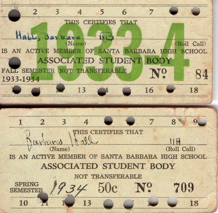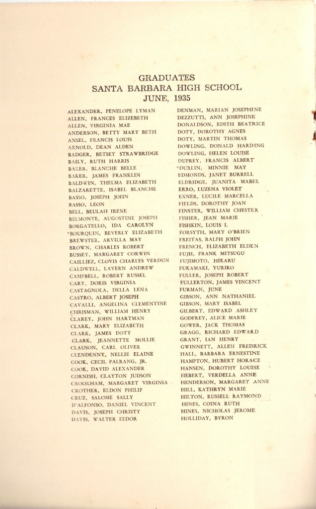 On the flyleaf of the 1936 Olive and Gold Santa Barbara High School yearbook is written in fine cursive, “Barb, Best wishes to my best friend and good luck in the future, as always your friend Blanche.”