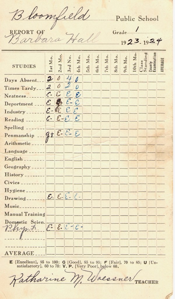 Take note of the difference in reporting. There are subjects for which she has grades which are no longer on any report card. Also of note her mother had to sign the card and return it to school to be recorded something else which is no longer done.